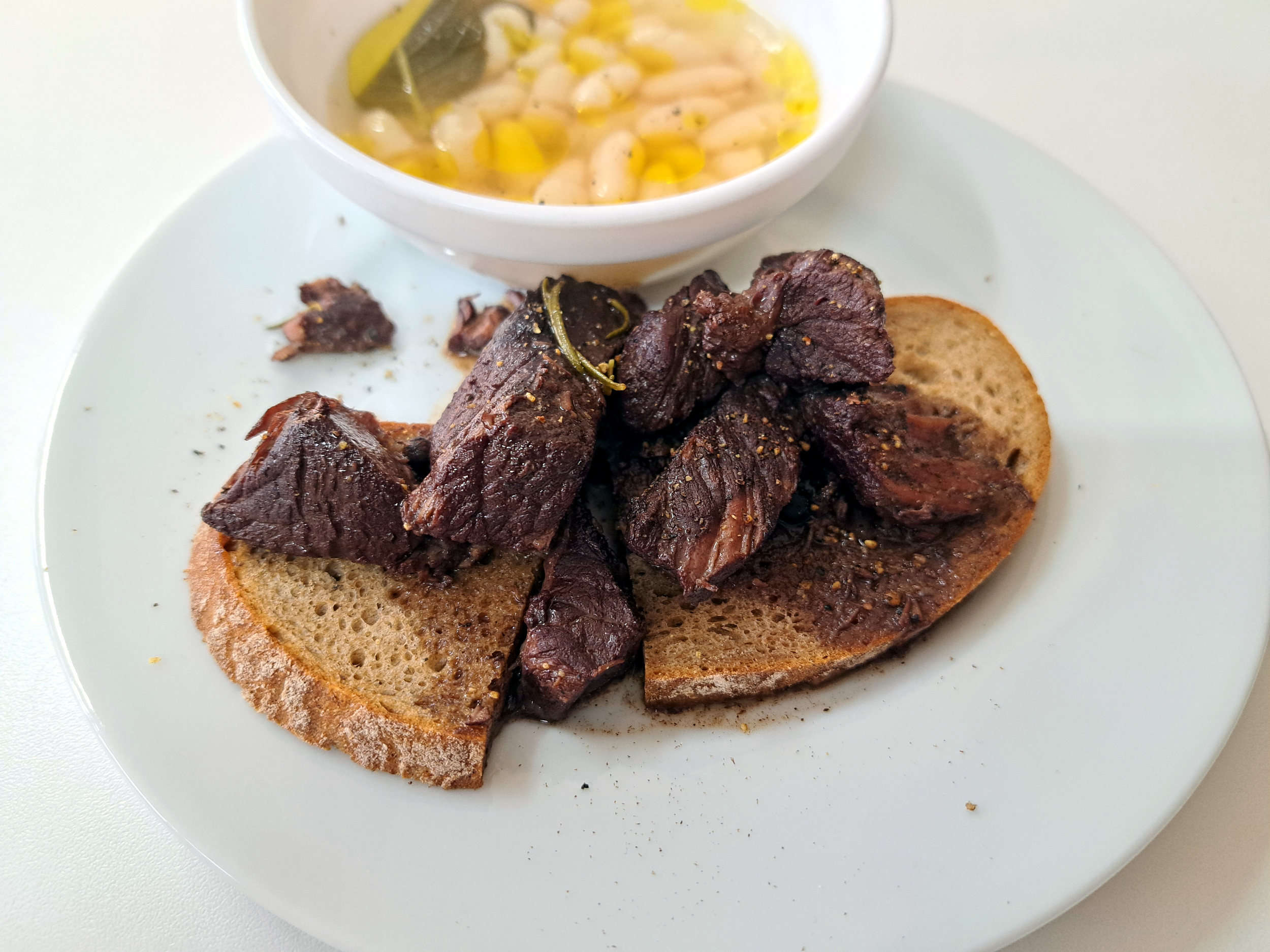 Tostare il pane sulla griglia, metterlo nei piatti e versarci sopra il peposo.