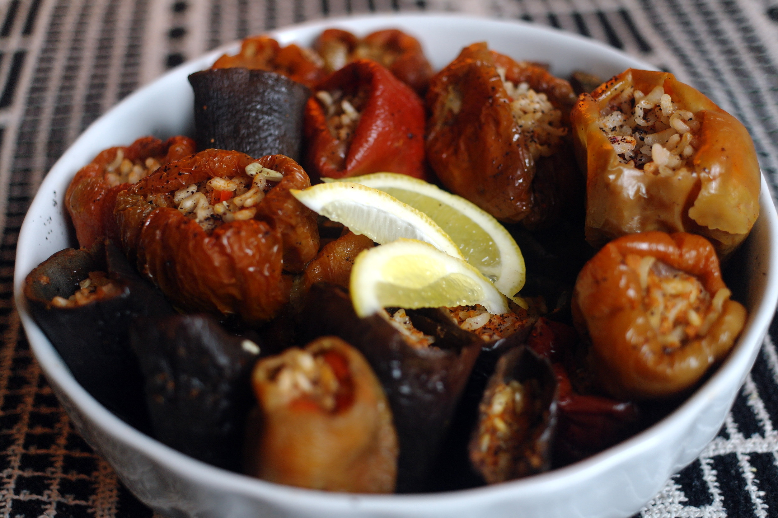 In una ciotola, mescolare tutti gli ingredienti, ad eccezione del succo di limone e dell'aglio, con l'acqua. Riempire le melanzane e i peperoni con questo composto, lasciando un dito di spazio dal bordo, e sistermarli in una pentola. Bagnare il tutto con un bicchiere dell'acqua di ammollo delle melanzane.