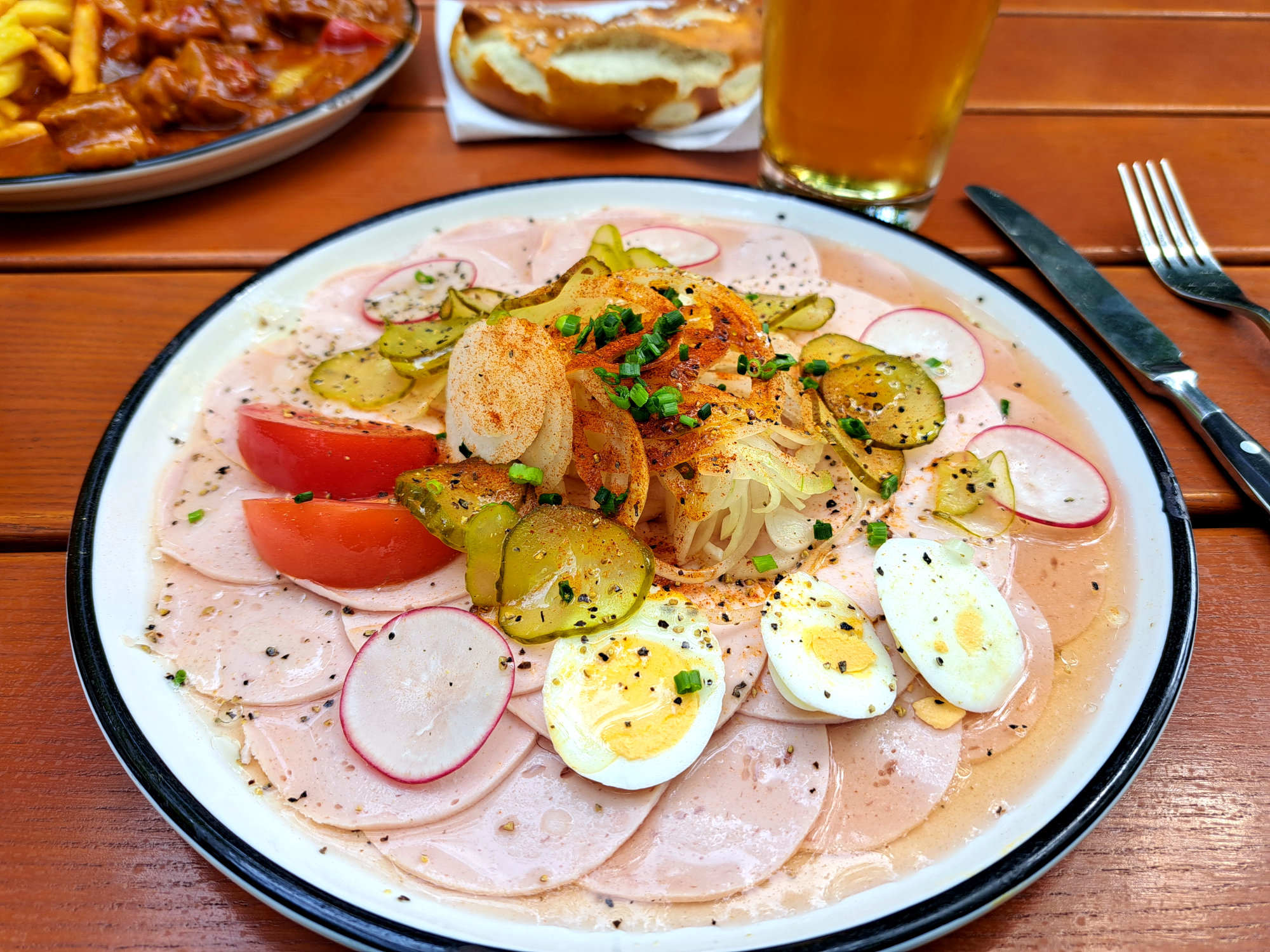 Il Bayrischer Wurstsalat è un piatto freddo tipico della Baviera, preparato con wurst tipo Lyoner affettato, cipolle e un condimento a base di aceto. È ideale come antipasto o piatto unico estivo, spesso accompagnato da pane tipo bauernbrot o brezel.