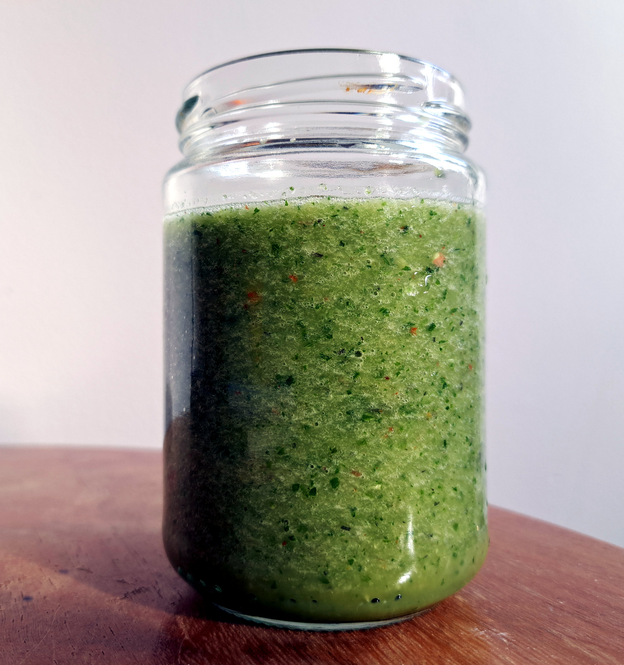 Sbucciare aglio e cipolla, pulire le verdure. Frullare o pestare tutti gli ingredienti fino a ottenere una salsa simile a un pesto. Versare in un barattolo, chiudere e conservare in frigo per massimo un mese.