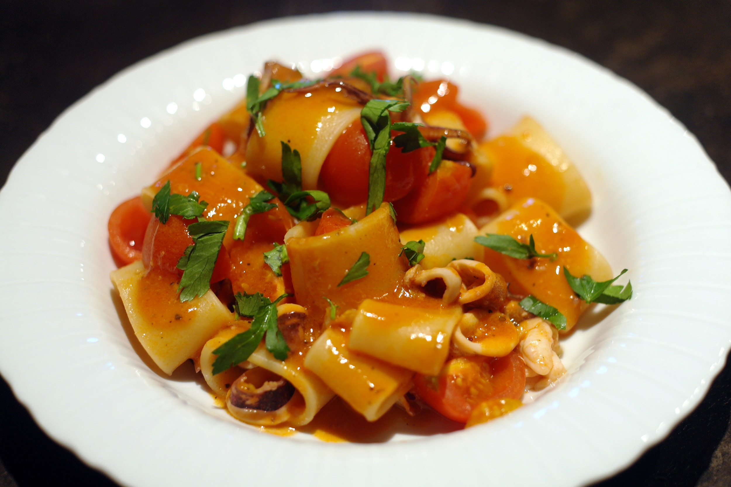 La calamarata è un primo piatto tipico della cucina napoletana, preparato con un formato di pasta ad anello simile ai calamari, conditi con un sugo di calamari freschi e pomodoro.
