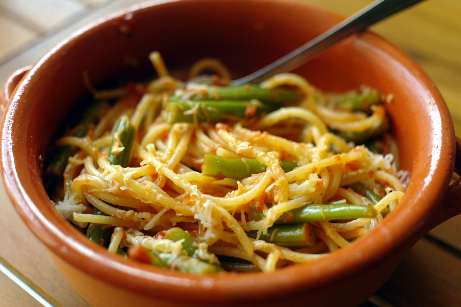 Un primo piatto della tradizione contadina pugliese, semplice e genuino. La pasta con fagiolini e pomodoro unisce sapori freschi dell'orto: fagiolini verdi - ideali quilli occhio pinto - lessati, sugo di pomodoro fresco, aglio e olio extravergine d'oliva.